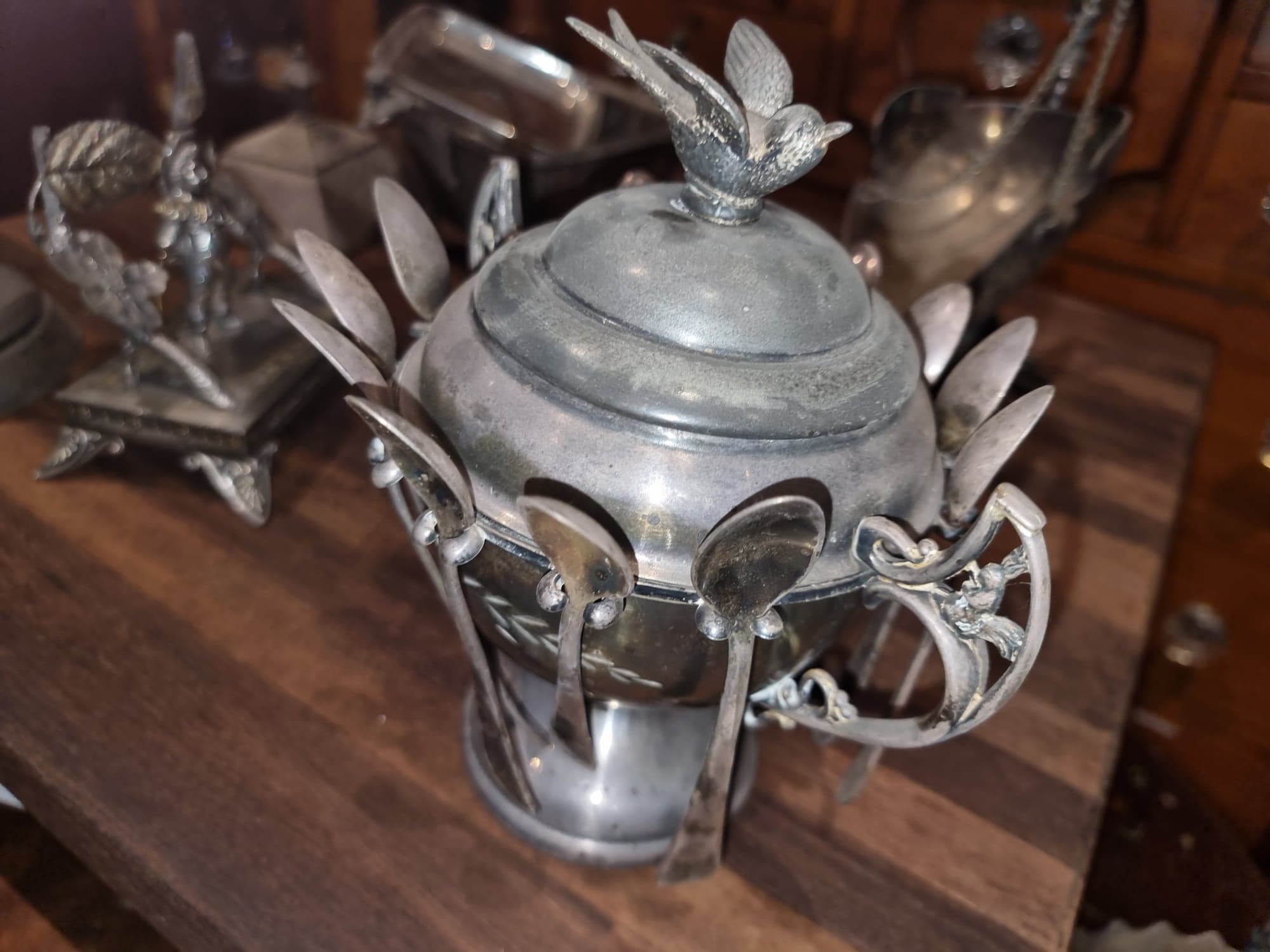 spooner comes with 12 spoons. It has a lovely bird figural finial, and