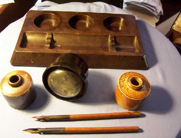 (middle), two stoneware ink bottles and two pens.